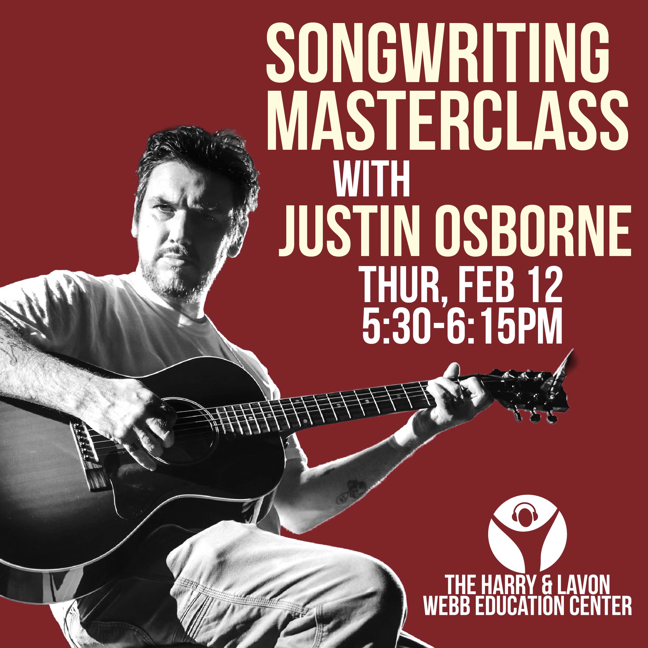 In this intimate, conversational session, Justin will share insights from his own creative process—how songs begin, evolve, and find emotional truth. Participants will explore lyric writing, melody, and the art of translating personal experiences into universal stories. Whether you’re an aspiring songwriter or simply curious about the craft, this is a unique opportunity to learn from one of today’s most thoughtful voices in contemporary music.